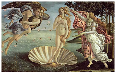 แสดงภาพวีนัสกำเนิดมาจากฟองน้ำยืนอยู่ในฝาหอย ท่าทางเขินอาย โดยมีเทพเจ้าแห่งลมเป่าให้ลอยเข้าสู่ฝั่ง การถ่ายทอดจินตนาการเรื่องราวกวีนิพนธ์และศาสนิยายสื่อออกได้อย่างดี