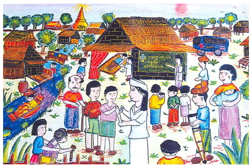 แสดงภาพจินตนาการผลิตซ้ำจากการระลึกถึง หน่วยแพทย์เคลื่อนที่ เข้ามาตรวจรักษาคนในหมู่บ้าน