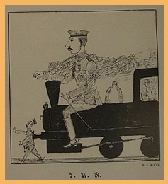 เป็นภาพการ์ตูนล้อ พระเจ้าบรมวงศ์เธอ พระองค์เจ้าบุรฉัตรไชยากร กรมพระกำแพงเพ็ชรอัครโยธิน ขณะเป็นกรมขุนกำแพงเพ็ชรอัครโยธิน ดำรงตำแหน่งผู้บัญชาการกรมรถไฟหลวง ถือได้ว่าเป็นการ์ตูนล้อการเมืองภาพแรกของไทย