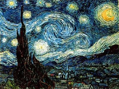 ภาพ Starry Night โดย Vincent Van Gogh ; 1889 มีการใช้ส่วนประกอบมูลฐาน คือ เส้น รูปร่าง น้ำหนัก สี มาจัดโครงสร้าง เป็นองค์ประกอบ ที่มีความสมดุล แบบสองข้างไม่เท่ากัน และมีจังหวะความเคลื่อนไหว ที่ลื่นไหล สั่นพริ้ว ภายใต้บรรยากาศที่กลม