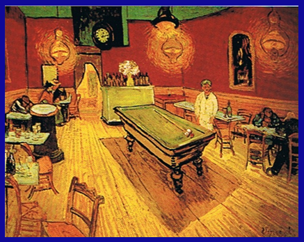 ชื่อภาพ "ภายในคาเฟ่" ผลงานของ วินเซนต์ แวนโก๊ะห์ เมื่อปี ค.ศ. ๑๘๘๘ ถ่ายทอดบรรยากาศคาเฟ่ในเวลากลางคืน