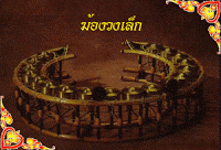 ฆ้องวง เป็นเครื่องตีที่คิดประดิษฐ์สร้างให้วิวัฒนาการมาโดยลำดับ จากฆ้องเดี่ยว และฆ้องคู่ แล้วฆ้องราง วงฆ้องใช้ต้นหวายโป่งทำเป็นร้าน สูงประมาณ ๒๔ ซม. หวายเส้นนอกกับเส้นในห่างกันประมาณ ๑๔-๑๗ ซม. ดัดโค้งเป็นวงล้อมไปเกือบรอบตัวคนนั่งตี เปิดช่องไว้สำหรับทางเข้าด้านหลังคนตี ห่างกันราว ๒๐-๓๐ ซม. ขนาดของวงกว้างจากขอบวงในทางซ้ายไปถึงขอบวงในทางขวา กว้างประมาณ ๘๒ ซม. จากด้านหน้าไปด้านหลัง กว้างประมาณ ๖๖ ซม. พอให้คนตีนั่งขัดสมาธินั่งตีได้สบาย แล้วเจาะรูลูกฆ้องทางขอบฉัตร ลูกละ ๔ รู ใช้เชือกหนังร้อยผูกกับเรือนฆ้อง ให้ปุ่มลูกฆ้องหงายขึ้นผูกเรียงลำดับขนาดลูกต้นไปหา ลูกยอดตั้งแต่ใหญ่ไปหาเล็ก เรียงลำดับเสียงตั้งแต่ต่ำไปหาสูง ฆ้องวงหนึ่งมีจำนวน ๑๖ ลูก ลูกต้นวัดผ่านศูนย์กลางประมาณ๑๗ ซม. อยู่ทางซ้ายมือด้านหลังผู้ตี และใช้ตีด้วยไม้ตีทำด้วยแผ่นหนังดิบตัดเป็นวงกลมเจาะกลางสอดด้ามไม้สำหรับมือถือ วงหนึ่งใช้ไม้ตี ๒ อัน ถือตีข้างละมือ การประดิษฐ์ฆ้องวงคงเกิดขึ้นก่อนระนาด เพราะมีภาพแกะสลักวงปี่พาทย์แต่โบราณ มีฆ้องวงแต่ไม่มีระนาด และในสมัยโบราณ