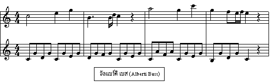 3. สไตล์แบบโฮโมโฟนิค (Homophonic Style) ความสำคัญอันใหม่ที่เกิดขึ้นแนวทำนองพิเศษในการประกอบทำนองหลัก (Theme) ก็คือลักษณะพื้นผิวที่ได้รับความนิยม มากกว่าสไตล์พื้นผิวแบบโพลี่โฟนีเดิม สิ่งพิเศษของลักษณะดังกล่าวนั่นก็คือ Alberti bass ซึ่งก็คือลักษณะการบรรเลงคลอประกอบแบบ Broken Chord ชนิดพิเศษ