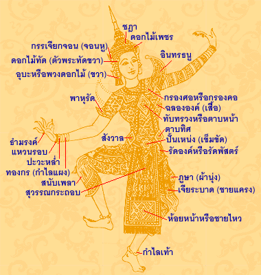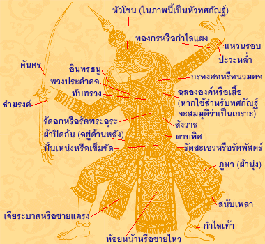 การแสดงนาฏศิลป์ไทย โดยเฉพาะการแสดงโขนนั้นได้จำแนกผู้แสดงออกเป็น 4 ประเภท ตามลักษณะของบทบาทและการฝึกหัด คือ ตัวพระ ตัวนาง ตัวยักษ์ และตัวลิง ซึ่งในแต่ละตัวนั้น นอกจากบุคลิกลักษณะที่ถ่ายทอดออกมาให้ผู้ชมทราบจากการแสดงแล้ว เครื่องแต่งกาย ของผู้แสดงก็ยังเป็นสัญลักษณ์ที่สำคัญอย่างหนึ่งที่บ่งบอกว่า ผู้นันรับบทบาทแสดงเป็นตัวใด เครื่องแต่งกายนาฏศิลป์ไทยมีความงดงาม และมีกรรม วิธีการประดิษฐ์ที่วิจิตรบรรจงเป็นอย่างยิ่งทั้งนี้เพราะที่มาของเครื่องแต่งกาย นาฏศิลป์ ไทยนั้น จำลองแบบมาจากเครื่องทรงของพระมหากษัตริย์ (เครื่องต้น) แล้วนำมาพัฒนาให้เหมาะสมต่อการแสดง ซึ่งจำแนกออกเป็น 4 ฝ่าย ดังนี้
