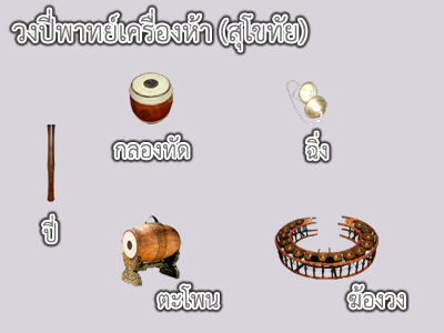 - สมัยที่หนึ่ง สมัยสุโขทัย พบว่ามีเครื่องดนตรีดังนี้