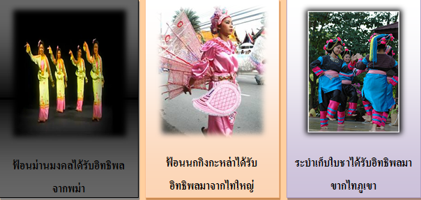 อิทธิพลของการแสดงนาฏศิลป์ที่ได้รับมาจากอิทธิพลของพม่าและชนเผ่าต่างๆ เช่น ฟ้อนม่านมงคล ฟ้อนม่านมุ้งเชียงตา ฟ้อนกิงกะหล่า ระบำเก็บใบชา เป็นต้น