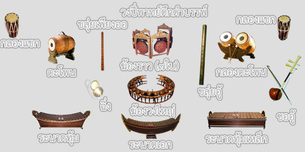 ที่มารูปภาพ : http://www.patakorn.com/modules.php?name=News&file=article&sid=43 วงปี่พาทย์ดึกดำบรรพ์ ที่ทรงปรับปรุงผสมวงขึ้น จึงประกอบด้วยเครื่องดนตรี ดังนี้ 1. ระนาดเอก (ตีด้วยไม้นวม) 2. ระนาดทุ้มไม้ 3. ระนาดทุ้มเหล็ก 4. ฆ้องวงใหญ่ 5. ซออู้ 6. ขลุ่ย 7. กลองตะโพน 2 ลูก (ตั้งหน้าขึ้นตีแทนกลองทัด) 8. ฆ้องหุ่ย 7 ลูก (ทำราวแขวนเทียบเสียงสูงต่ำเรียงลำดับกัน) 9. ตะโพน 10. ฉิ่ง ดูเหมือนว่าแต่นั้นมา ในวงการปี่พาทย์ไทย ก็เกิดมีศิลปในการบรรเลงขึ้นเป็น 2 อย่าง เรียกกันว่า "ปี่พาทย์ไม้แข็ง" อย่างหนึ่ง และ "ปี่พาทย์ไม้นวม" อย่างหนึ่ง จะเป็นปี่พาทย์เครื่องห้า เครื่องคู่ หรือเครื่องใหญ่ก็ตาม ถ้าใช้ไม้ตีระนาดเอกชนิดไม้ตีทำแข็ง โดยพอกผ้าชุบน้ำรักตีเข้าผสมวง เรียกว่าปี่พาทย์ไม้แข็ง ถ้าไม้ตีใช้พันผ้าแล้วถักด้วยเส้นด้ายสลักจนนุ่ม ตีเข้าผสมวง ใช้ขลุ่ยเป่าแทนปี่ และบางทีก็ใช้ซออู้เข้าเล่นผสมด้วย เรียกว่า ปี่พาทย์ไม้นวม
