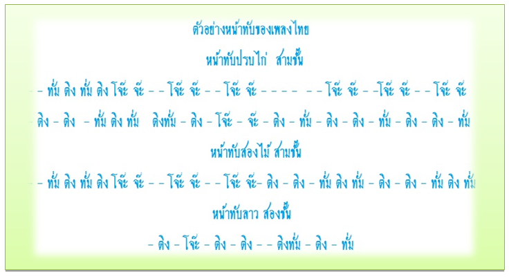ซึ่งเครื่องดนตรีเหล่านี้จะทำหน้าที่บรรเลงกำกับและประกอบจังหวะไปตามจังหวะ ซึ่งทางวิชาการดนตรีไทยเรียกว่า "หน้าทับ"และฉิ่งจะทำหน้าที่กำหนดจังหวะ ที่เรียกว่า "จังหวะฉิ่ง"
