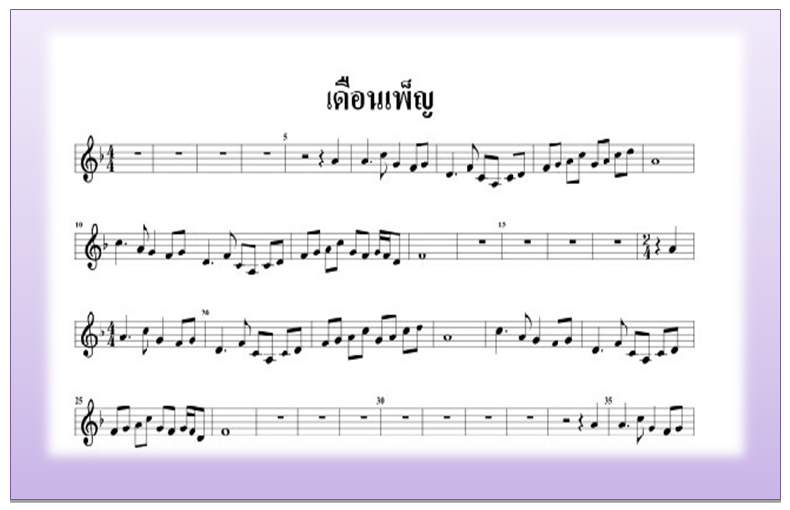 เพลงเดือนเพ็ญ มีการกำหนดอัตราจังหวะไว้ที่ 4 : 4 ดังรูปตัวอย่าง ดนตรีเป็นโสตศิลป์ที่เกี่ยวข้องกับเสียงและเวลาเวลาในทางดนตรีถูกกำหนด โดยใช้เครื่องหมายกำหนดจังหวะเป็นตัวเลขคล้ายกับเลขเศษส่วนแต่ไม่มีเส้นตรงขีดระหว่างตัวเลขบนและล่าง