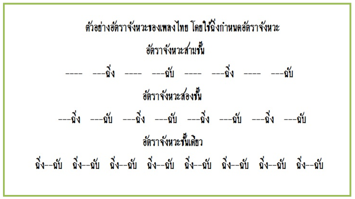 จังหวะเป็นสิ่งที่สำคัญในการการสร้างสรรค์บทเพลง จังหวะเป็นเครื่องกำหนดความช้า ความเร็วของบทเพลง ในดนตรีไทยได้มีการกำหนดให้เป็นกฎเกณฑ์ที่ตายตัวเหมือนดนตรีตะวันตก เพียงแต่จะเป็นการตกลงร่วมกันในหมู่นักดนตรีเองว่า แต่ละเพลงนั้นจะให้บรรเลงด้วยความช้า ความเร็วเพียงใด ดังนั้นจึงเป็นไปได้ว่า ในบางครั้งเพลงๆเดียวกัน บรรเลงโดยนักดนตรีต่างวง จะมีความช้าความเร็วของแต่ละวงไม่เท่ากัน