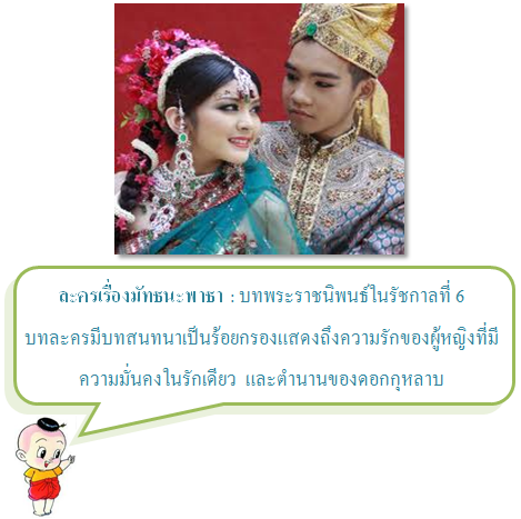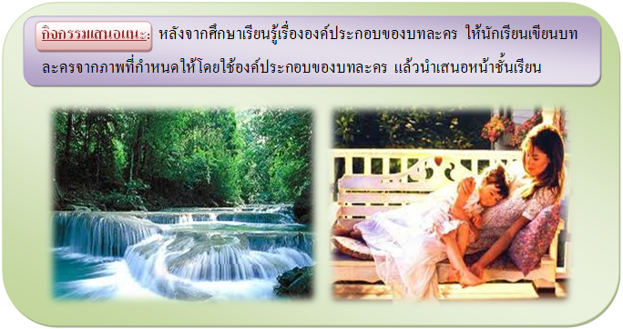 1.3ตัวละครและการวางลักษณะนิสัยของตัวละครตัวละคร คือ ผู้ดำเนินเรื่องราวต่างๆเป็นผู้ที่ได้รับบทบาทจากผู้ขียนละครให้มีลักษณะนิสัย บุคลิกลักษณะเพื่อแสดงสื่อให้ผู้ชมเกิดความเข้าใจในเนื้อหาและแก่นของเรื่อง และตัวละครในเรื่องจะต้องมีความเกี่ยวข้องสัมพันธ์กัน 1.4 บทสนทนาเป็นการใช้ถ้อยคำอย่างมีศิลปะให้ตัวละครได้ใช้พูดในการแสดง ผู้เขียนบทละครที่มีความสามารถจะต้องเขียนบทสนทนาได้ตรงตามประเภทของบทละคร ซึ่งจะเป็นลักษณะของ ร้อยแก้ว