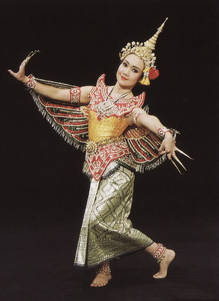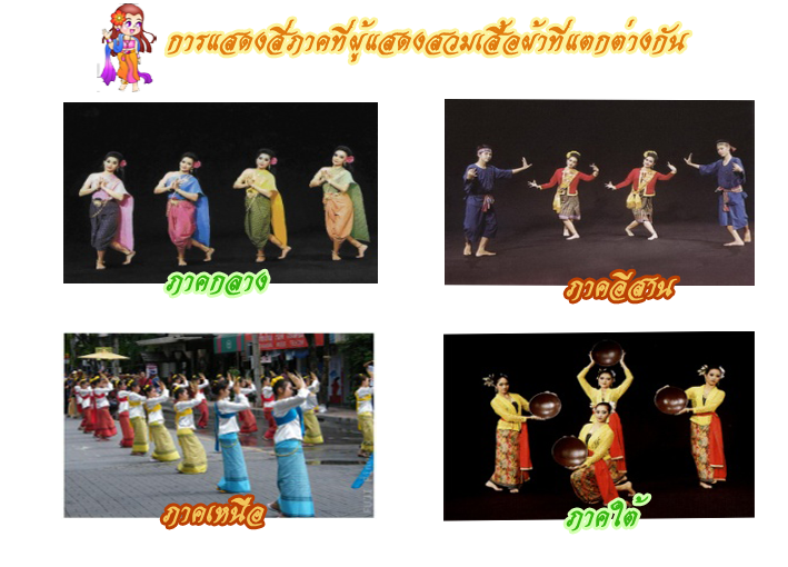 1.2.6 การแต่งกาย ในการแสดงนาฏศิลป์ไทย องค์ประกอบเรื่องเครื่องแต่งกายเป็นสิ่งสำคัญ เช่น การแต่งกายของ โขน [9] ละคร แต่งกายยืนเครื่องมีลักษณะสีสันของเครื่องแต่งกายแตกต่างกันไป เช่น หนุมานใช้สีขาว พระรามใช้สีเขียว พระลักษณ์ใช้สีเหลือง พาลีใช้สีแดง เป็นต้น การประดิษฐ์เครื่องประดับตกแต่งและการแต่งกายจะบ่งบอกลักษณะของการแสดง เช่น ภาคเหนือ ภาคใต้ ภาคอีสาน ภาคกลาง การแสดงพื้นเมืองจะแต่งกายแตกต่างกัน