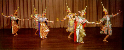 (1) โขนโขนเป็นการแสดงชั้นสูงของไทย เป็นศิลปะของการเต้นที่ผู้แสดงสวมศรีษะโขน มีการแสดงท่าทางตามบทพากษ์ และเจรจาของผู้พากษ์ มีท่าทางร่ายรำตามเพลงหน้าพาทย์ประกอบกิริยาอาการของผู้แสดง การแต่งกายยืนเครื่องพระ นาง ยักษ์ ลิง พร้อมด้วยอุปกรณ์ประกอบการแสดงที่ถูกตกแต่งด้วยความประณีตตามลักษณะงานศิลปะช่างสิบหมู่ของไทย เช่น ฉากโขน ราชรถ อาวุธที่ใช้ประกอบการแสดง ศรีษะโขนแต่ละตัว และสีของเครื่องแต่งกายที่บ่งบอกลักษณะของตัวโขน [4] นิยมแสดงเรื่องรามเกียรติ์