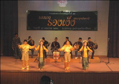 การรำเถิดเทิงกลองยาวที่ผู้แสดง มีสีหน้าสนุกสนานร่าเริง