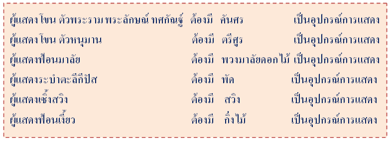 1. ประโยชน์ของอุปกรณ์ที่ใช้ ควรให้มีความแข็งแรงสามารถนำมาใช้ได้หลาย ๆ ครั้ง และดัดแปลงไปใช้กับชุดการแสดงได้หลาย ๆ ชุด และมีการบำรุงรักษาทุกครั้งที่ใช้