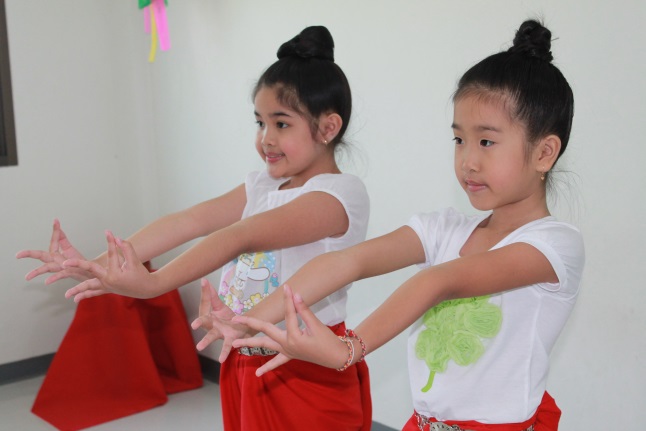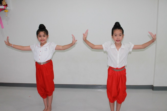 โบกมือ มือซ้ายตั้งวงบน มือขวาจีบส่งหลัง
