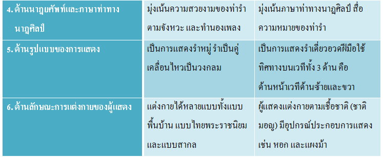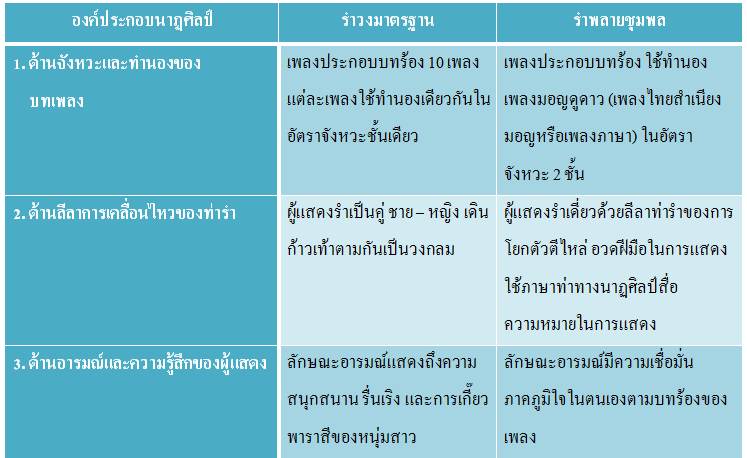 ตารางเปรียบเทียบความแตกต่างของ การแสดงรำวงมาตรฐาน กับ การแสดงรำพลายชุมพล