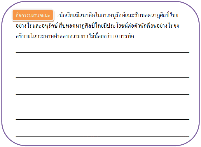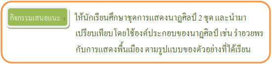 ตามที่นักเรียนได้เรียนรู้เรื่ององค์ประกอบของนาฏศิลป์ ซึ่งสรุปได้ว่ามี 6 ด้าน คือ
