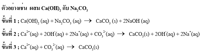 2. ถ้าสารที่เกี่ยวข้องในปฏิกิริยาเป็นสารที่ไม่ละลายน้ำหรือไม่แตกตัวเป็นไอออนหรือเป็นออกไซด์หรือเป็นก๊าซให้เขียนสูตรโมเลกุลของสารนั้นในสมการได้ ตัวอย่าง ออกไซด์ เช่น CO2 , H2O ก๊าซ เช่น H2 , NH3 สารที่ไม่ละลายน้ำ เช่น CaCO3 , AgCl