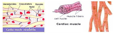 กล้ามเนื้อหัวใจประกอบเป็นกล้ามเนื้อหัวใจเพียงแห่งเดียวอยู่นอกอำนาจจิตใจ โดยควบคุมโดยระบบประสาทอัตโนมัติ มีลักษณะเป็นเซลล์รูปทรงกระบอกมีลายตามขวางเป็นแถบสีทึบสลับกับสีจาง เซลล์กล้ามเนื้อตอนปลายของเซลล์มีการแตกแขนง ไปประสานกับแขนงของเซลล์ใกล้เคียงเซลล์ทั้งหมดจึงหดตัวพร้อมกัน และหดตัวเป็นจังหวะตลอดชีวิต