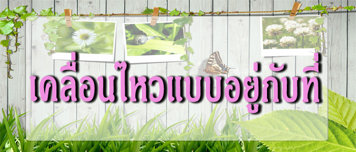 เคลื่อนไหวแบบอยู่กับที่ การเคลื่อนไหวร่างกายแบบอยู่กับที่ เป็นการเคลื่อนไหวที่ปฎิบัติโดยไม่มีการเคลื่อนที่ของร่างกาย เช่น การก้มหน้า การบิดตัว การยกเข่าไปด้านหลังเป็นต้น