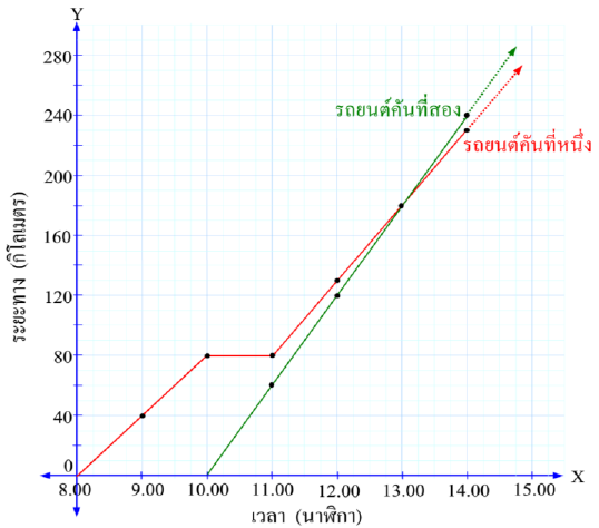 | 4. จากกราฟถ้ารถยนต์ทั้งสองคันยังแล่นต่อไปด้วยอัตราเร็วเท่าเดิม จนถึงเวลา 14.30 น. รถยนต์ทั้งสองคันจะอยู่ห่างกันประมาณเท่าใด |