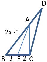20. กำหนดให้ AE เป็นเส้นแบ่งครึ่งมุม A และ AE // CD ดังรูป AB = 2x -1, AC = X, BE ยาว 3 หน่วย CE ยาว 2 หน่วย จงหาความยาวของ x