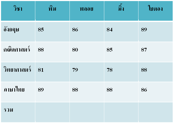 ตารางแสดงคะแนนสอบปลายภาคของเด็ก 5 คน
