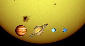 ดาวแก๊สยักษ์ทั้ง 4 ดวงของระบบสุริยะ เปรียบเทียบขนาดกับดวงอาทิตย์ (ตามสัดส่วนจริง)