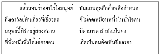 4. “ที่พึ่งหนึ่งพึ่งได้แต่กายตน เกิดเป็นคนคิดเห็นจึงเจรจา” บทร้อยกรองนี้ ใช้ เครื่องหมายอะไร |