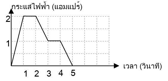 13.จากกราฟแสดงกระแสไฟฟ้าที่ไหลผ่านเส้นลวดหนึ่งกับเวลา จงหาว่าเมื่อสิ้นสุดเวลา t = 5 วินาที จะมีประจุไฟฟ้าผ่านลวดเส้นนี้กี่คูลอมบ์