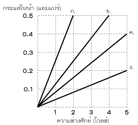 19.จากกราฟต่อไปนี้ แสดงถึงความสัมพันธ์ระหว่างความต่างศักย์ระหว่างปลายทั้งสองของตัวต้านทานและกระแสไฟฟ้าที่ไหลผ่านตัวต้านทาน ก. ข. ค. และ ง. ตัวต้านทานตัวไหนมีความต้านทานมากที่สุด