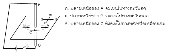 34. A,B และ C เป็นเข็มทิศเบาวางอยู่บนกระดาษราบ เส้นลวดตัวนำ PQ ตั้งฉากกับกระดาษและต่อกับสวิทซ์ S อนุกรมกับเซลไฟฟ้าดังรูป เมื่อสับสวิทซ์ S ลง คำกล่าวต่อไปนี้ข้อใดถูก