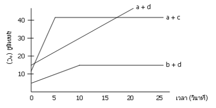 17. จากกราฟ a, b, c และ d เป็นของเหลวเนื้อเดียว ใส ไม่มีสี เมื่อนำของผสมในอัตราส่วน 1 : 1 ซึ่งรวมเป็นเนื้อเดียวกันของ a กับ c , a กับ d และ b กับ d ไปกลั่น แล้วหาความสัมพันธ์ระหว่างอุณหภูมิกับเวลาได้กราฟดังรูป จากข้อสรุปต่อไปนี้ข้อใดถูกต้อง