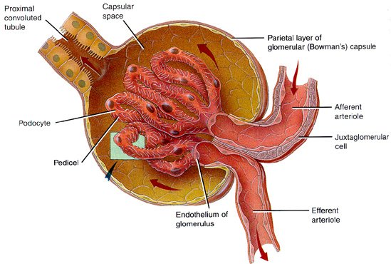 2. โกลเมอรูลัส(glomerulus) เ ป็นกระจุกเส้นเลือดฝอยต่อจากเส้นเลือดแดงที่เข้าไต(renal artery) อยู่ภายในโบว์แมนส์แคปซูล