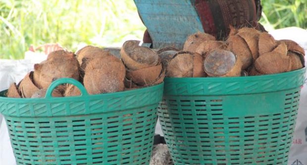 วัสดุเหลือใช้อย่างหนึ่งของมะพร้าวคือ “กะลามะพร้าว” ในอดีตเมื่อเอาเนื้อออกใช้ประโยชน์หมดแล้วก็เป็นเศษวัสดุที่ไม่ค่อยมีราคาค่างวดสักเท่าไร คนสมัยก่อนมักนำไปใช้ทำเชื้อเพลิง หรือทำเครื่องใช้ในครัวเรือน เช่น กระบวยตักน้ำ ทัพพี ถ้วย ชาม ฯลฯ ความสำคัญของกะลามะพร้าวในสมัยก่อนมีค่าไม่มากนัก และมักจะมีการเปรียบเปรยคนที่ใช้ชีวิตอย่างไร้คุณค่า ว่าเหมือนกับกะโหลกกะลา ทางภาคใต้ผู้ที่ชอบเถลไถลไม่ประกอบอาชีพอะไรเป็นหลักแหล่ง มักจะถูกเรียกขานว่า “ไอ้พลกไอ้ต้อ” ซึ่งเป็นการบ่งบอกถึงความไร้ค่าเสมอเหมือนดั่งกะลา ต่อมาภูมิปัญญาไทยจากหลายแหล่งทั่วทุกภาคของประเทศ ได้คิดประดิษฐ์โดยการนำกะลามะพร้าวมาเป็นวัสดุเพื่อเพิ่มคุณค่า จากกะลาที่ไร้ค่าจึงได้รับการพัฒนามาเป็นผลิตภัณฑ์ที่ได้รับความสนใจจากผู้คน ในรูปแบบเครื่องใช้ในครัวเรือนเครื่องตกแต่งบ้าน อาทิ โคมไฟ ตะเกียงเจ้าพายุ ฯลฯ เครื่องประดับ เครื่องแต่งกายสุภาพสตรี อาทิ กระเป๋าถือ เข็มขัด เข็มกลัด ปิ่นปักผม สร้อย ฯลฯ ซึ่งผลิตภัณฑ์เหล่านี้เป็นที่นิยมของชาวไทย และชาวต่างชาติในปัจจุบัน นับเป็นการสร้างรายได้ให้แก่คนไทยที่มีชีวิตเกี่ยวข้องกับมะพร้าวได้เป็นอย่างดี