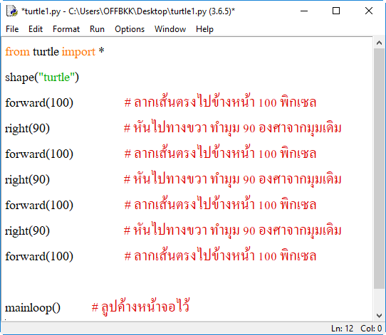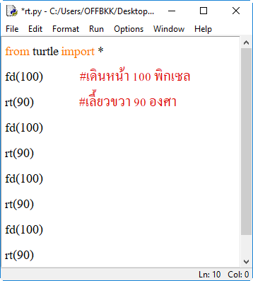 บรรทัดบนสุดของโค้ดคำสั่ง จะต้องใช้คำสั่ง from turtle import * เพื่อเรียกใช้ตัวแปร ฟังก์ชัน หรือเมธอดทั้งหมดจากโมดูล turtle เพื่อใช้ในการวาดภาพได้