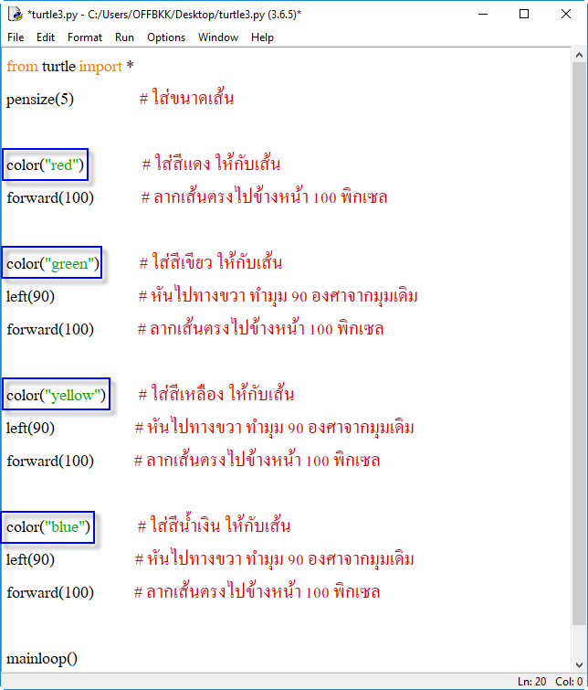 3. pensize() เป็นคำสั่งสำหรับใช้กำหนดขนาดตัวเต่าและขนาดของเส้นเป็นหน่วยเป็นพิกเซล เช่น pensize(3)
