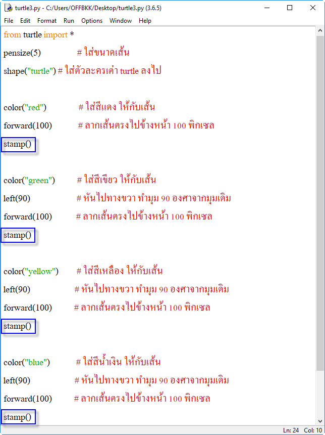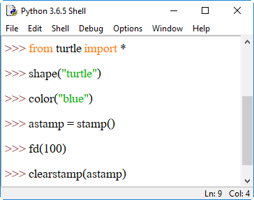 12. stamp() ปั๊มตัวเต่าให้อยู่ในตำแหน่งที่กำหนด เช่น เมื่อเดินเต่าเดินหน้าไป 100 พิกเซล ให้ทำการปั๊มรูปเต่าไว้ตำแหน่งนั้น ตัวอย่างเช่น
