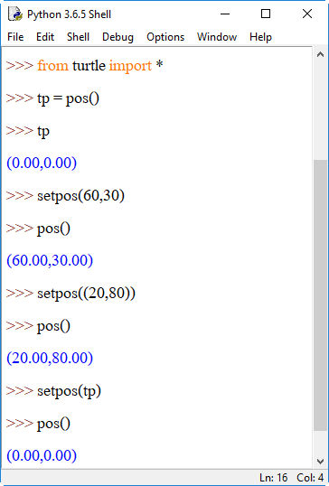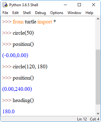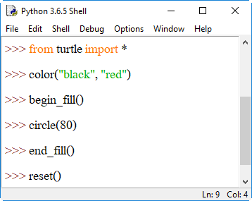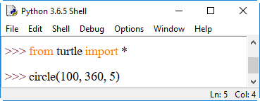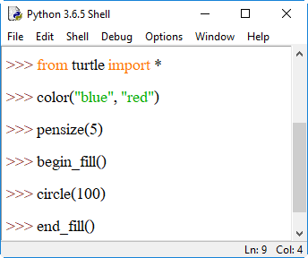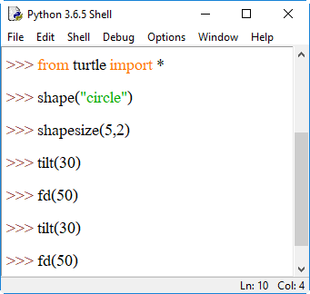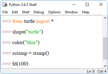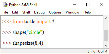 4. shape() เป็นการระบุรูปร่างของตัวเต่า โดยระบุรูปร่างเป็นสตริงอยู่ภายในวงเล็บ () ได้แก่ "arrow", "turtle", "circle", "square", "triangle", "classic" ลงไป เช่น shape("circle") หรือ shape("square") หากต้องการเปลี่ยนกลับเป็นรูปลูกศรให้ใช้ shape("classic")