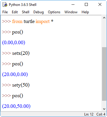 5. goto(x, y) / setpos(x, y) / setposition(x, y) ย้ายเต่าไปยังตำแหน่งที่แน่นอน โดยไม่เปลี่ยนทิศทางของเต่า ตัวอย่างเช่น