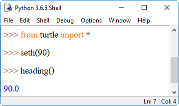 8. setheading() / seth() กำหนดหัวเต่าให้หันไปตามทิศที่ต้องการ ในวงเล็บให้ใส่ตัวเลของศาเข้าไป โดย 0 คือทิศตะวันออก, 90 คือ ทิศเหนือ, 180 คือ ทิศตะวันตก และ 270 คือ ทิศใต้