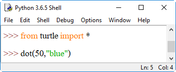 11. dot(ขนาดเส้นผ่านศูนย์กลาง, "สี") ใช้วาดจุดวงกลม โดยระบุเส้นผ่านศูนย์กลางและสี