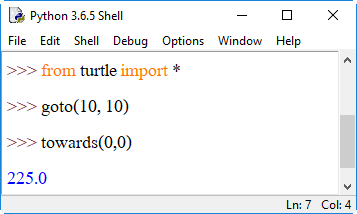 2. towards(x, y) ส่งกลับค่ามุมระหว่างเส้นจากตำแหน่งเต่าไปยังตำแหน่งที่ระบุ