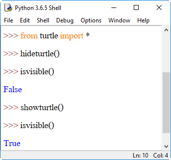 3. isvisible() ส่งกลับค่า True ถ้าอยู่ในสถานะแสดงตัวเต่า ส่งกลับค่า False ถ้าอยู่ในสถานะซ่อนตัวเต่า