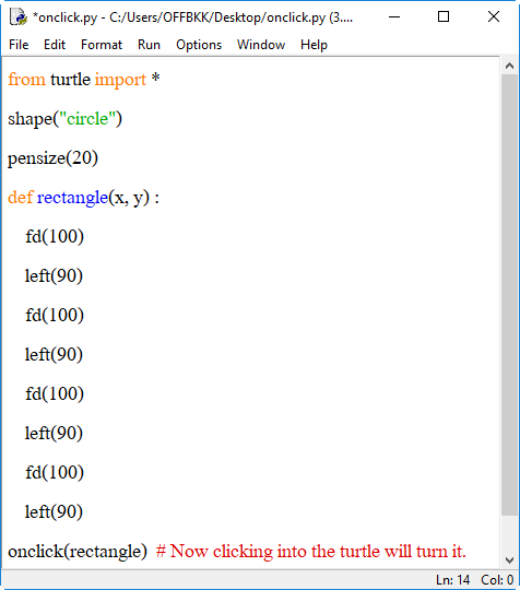 1. onclick() กำหนดเหตุการณ์เมื่อมีการคลิกเมาส์ที่ตัวเต่า โดยมีการส่งค่าพิกัด x, y ของจุดที่คลิกบนตัวเต่า เช่น เมื่อคลิกที่ตัวเต่าให้โปรแกรมเรียกฟังก์ชัน rectangle