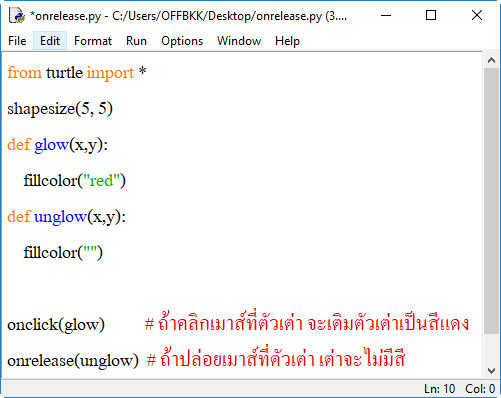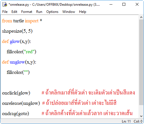 2. onrelease() กำหนดเหตุการณ์เมื่อมีการปล่อยเมาส์ที่ตัวเต่า