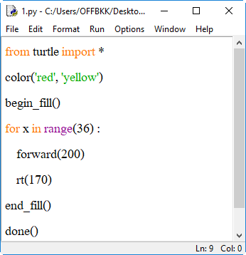 2. end_fill() เติมสีรูปทรง โดยจะต้องใส่คำสั่งนี้หลังคำสั่ง begin_fill()