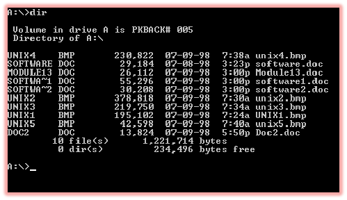 คำสั่ง DIR (Directory) ใช้เพื่อแสดงรายชื่อไฟล์(Filename) ใน Disk Drive หรือไดรฟ์ A: สามารถพิมพ์คำสั่งได้ดังนี้