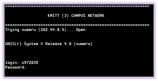 ตัวอย่าง การ เริ่มต้นเข้าสู่ระบบ Unix OS ที่ต้องใช้ชื่อผู้ใช้ (login) และรหัสผ่าน (password) ให้แก่ระบบเพื่อตรวจสอบว่าได้รับการอนุญาตการเข้าใช้ระบบจากผู้บริหารระบบ แล้ว